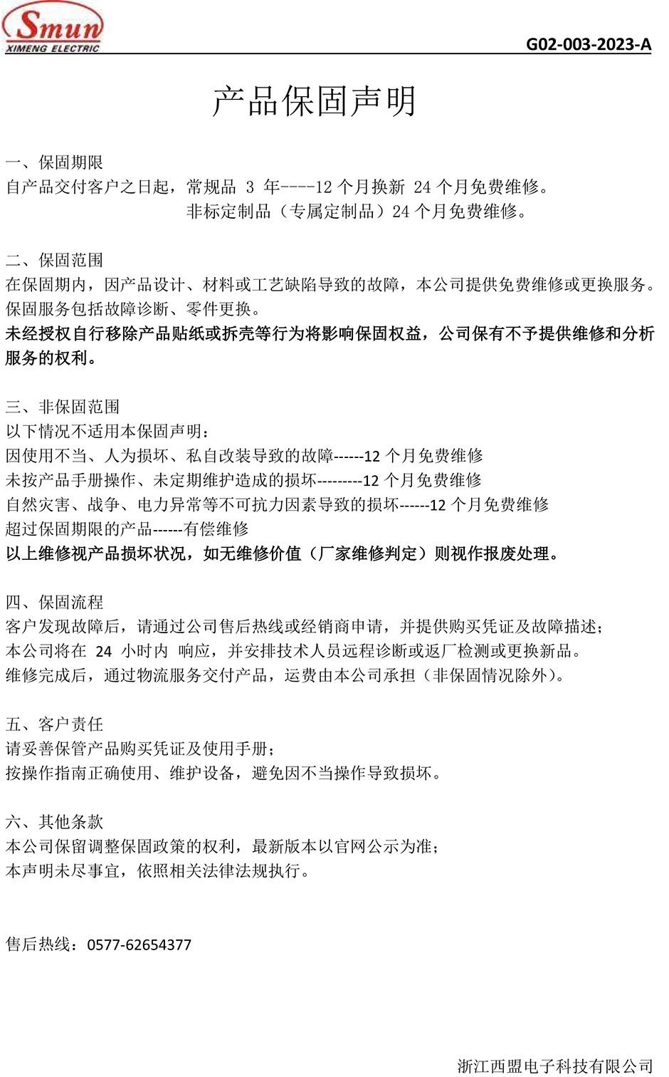 產品保固聲明