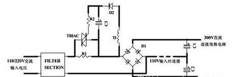 有源沖擊電流限制電路 (橋式整流時的沖擊電流大),在電路在剛啟動時,沖擊電流被電阻R1限制,當輸入電容充滿電后,有源旁路電路開始工作將電阻R1旁路,這樣在穩(wěn)態(tài)工作時的損耗會變得很小。在這種可控硅啟動電路中,很容易通過開關(guān)電源主變壓器上的一個線圈來給可控硅供電,由開關(guān)電源的緩啟動來提供可控硅的延遲啟動,這樣在開關(guān)電源啟動前就可以通過電阻R1將輸入電容充滿電。
