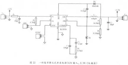 4、開關電源PCB排版例2圖22是另一種降壓式開關電源,該電源能使12V輸入電壓轉換成3.3V輸出電壓,輸出電流可達3A。此電源上使用了一個集成電源控制器(Semtech型號SC4519)。這種控制器將一個功率管集成在電源控制器芯片中。這樣的電源非常簡單,尤其適合應用在便攜式DVD機,ADSL,機頂盒等消費類電子產品。