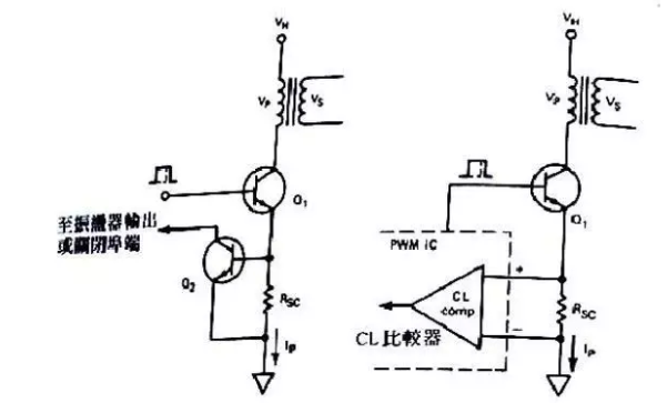 (a)圖:在輸出端有過載或短路情況發生時,此時初級電流會很快的增加,Rsc上的就會產生電壓,此電壓超過B-E的導通電壓,那么Q2就會導通,就會把Q2集電極電位拉到地,如果接的是震蕩電路此時就會導至震蕩電路停止工作,從而達到保護的目的。