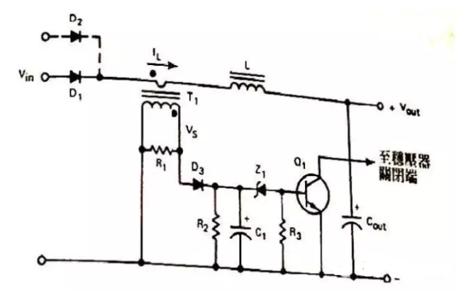 工作原理是:T1用來檢測負載電流IL,因此電阻R1會有成比例的電壓產生。D3為整流二極管,R3C1整流后的濾波電路,若電流過載發生時,電容器C1上的電壓會增加到穩壓二極管Z1的導通電壓,此時三極管Q1會導通,因此Q1集電極上的信號可以關閉穩壓器的驅動信號。