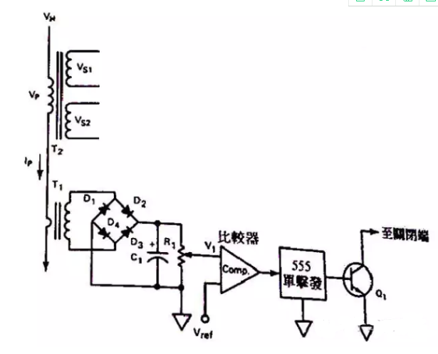 T1用來檢測T2的初級電流,T1后經二極管整流后電容濾波,可變電阻R1用來設定比較器輸入端的臨限電壓,在正長工作情況下,比較器的Vref參考輸入端電壓會高于電衛器R1上的電壓,此時比較器的輸出會在高電平,此時的555IC(單激多諧振蕩器)會有低電平的輸出,使Q1保持在關閉狀態。