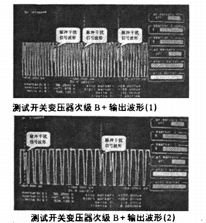 鑒于上述工作原理,對故障現象及原因分析:我廠生產的AT2516UG機器,在電源工作時,開關變壓器有明顯的哧、哧,根據以往經驗判斷此響聲為開關變壓器工作時產生的噪聲。由此,對開關變壓器次級(12)B+腳進行波形測試,具體測試如下: