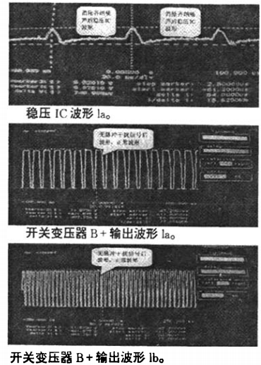 通過在TL431并聯0.47/63V電容后,再次測試TL431穩壓TC負極波形,不規則噪聲頻率消失(如圖穩壓ICla);測試開關變壓器次級B+波形(如圖開關變壓器次級B+波形1a1b),波形中130uS-70uS周期脈沖干擾信號消失;此時再也聽不到變壓器“哧哧”響聲。具體測試經上述更改后整機哧、哧聲消失,并且對正常工作無任何影響。使電源工作更穩定。