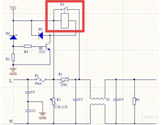 開關(guān)電源中初期階段繼電器是斷開的。當VCC逐漸達到自身電壓的時候,穩(wěn)壓二極管D1導(dǎo)通,三極管Q1打開,繼電器K1閉合,相當于把限流NTC熱敏電阻R1短路。