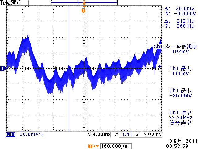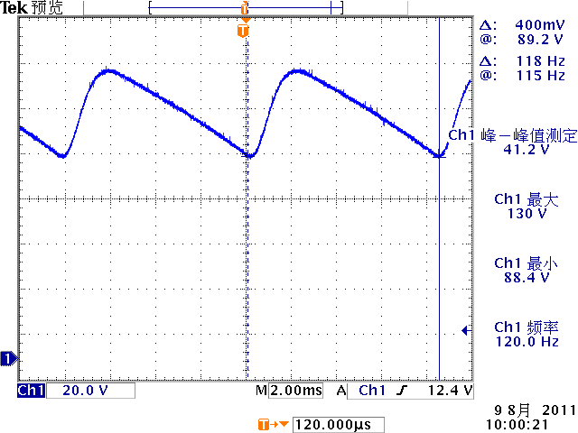 低頻紋波是與輸出電路的濾波電容容量相關(guān)。因為開關(guān)電源體積的約束,電解電容的容量不可能無約束地添加,導(dǎo)致輸出低頻紋波的殘留,該輸出紋波頻率隨整流電路方式的不同而不同。