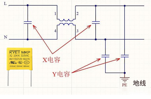 開關電源中的安規電容一般有X電容和Y電容,X電容是安裝在零線與前方之間,Y電容一般是安裝在地線與前方或地線與零線之間,詳細的用法如下圖所示: