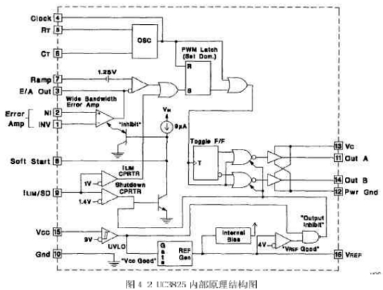 該芯片內(nèi)部電路如圖4-2所示。它由振動器、PWM比較器、限流比較器、過流比較器、基準電壓源、故障鎖存器、軟發(fā)動電路、欠壓確認、PWM鎖存器、輸出驅(qū)動器等組成。咱們將具體介紹各部分的狀況,以理解芯片的作業(yè)原理。