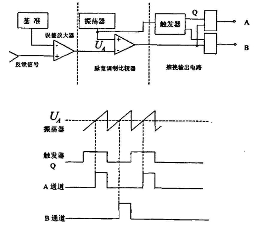 開關(guān)電源常用的脈寬調(diào)制(PWM)型集成操控器如圖4-1所示的幾個部分組成。基準電壓和采樣反應(yīng)信號經(jīng)過差錯擴大器比較擴大后,輸出的差值信號和鋸齒波(或三角波)比較,從而改變輸出脈沖的寬度,以完結(jié)穩(wěn)壓。有些操控器儀有一個輸出端,而多數(shù)操控器都設(shè)有用觸發(fā)器和“與”門電路組成的相位分離器,用它來將單-脈沖改換成替換改變的二路脈沖輸出,用于供驅(qū)動推挽和橋式改換器中的功率開關(guān)管,此刻改換器的作業(yè)頻率等于操控器內(nèi)部鋸齒波振動器振動頻率的一半。當(dāng)然也可將操控器的兩路輸出并聯(lián)起往來不斷驅(qū)動單端改換器或串聯(lián)調(diào)整型穩(wěn)壓開關(guān)電源中的功率開關(guān)管,此刻開關(guān)穩(wěn)壓電源的工.作頻率就等于操控器內(nèi)部鋸齒波振動器的頻率。
