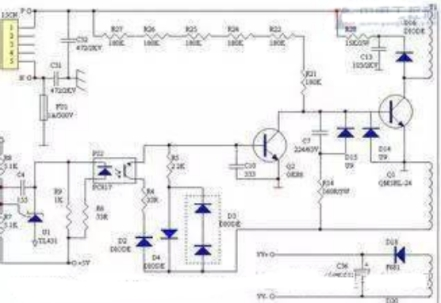 3、維護(hù)回路:PC1芯片本身和3腳外圍元件R4構(gòu)成過(guò)流維護(hù)回路;N1繞組上并聯(lián)的D2、R6、C4元件構(gòu)成了IGBT的維護(hù)電路;實(shí)質(zhì)上穩(wěn)壓回路的電壓反應(yīng)信號(hào)——穩(wěn)壓信號(hào),也可看作是一路電壓維護(hù)信號(hào)。但維護(hù)電路的內(nèi)容并不僅是局限于維護(hù)電路本身,維護(hù)電路的起控往往是因?yàn)樨?fù)載電路的異常所引起。