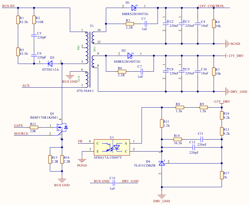 假設輔助開關電源SPS采用了經典的單管反激變換器,如圖5所示,SPS從變頻器的BUS電容上取電,這里為了簡化電路,變壓器T1的輸出只設計了兩路輸出電壓,分別給IGBT的驅動器和MCU側供電,從前面的定義可以看出,給MCU供電的+24V_CONTROL就是SELV電路,需要與其他電路之間做加強絕緣處理,也就是變壓器T1的pin12-pin14所在的繞組與其余繞組之間必須滿足加強絕緣要求,同時,在PCB板上,+24V_CONTROL所在電路與其他電路之間的爬電距離也必須滿足加強絕緣要求。