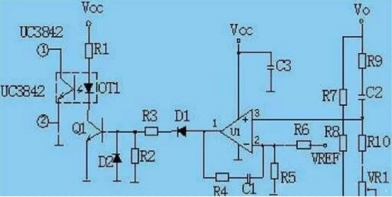 輸出限壓保護電路:輸出限壓保護電路如下圖,當輸出電壓升高,穩壓管導通光耦導通,Q1基極有驅動電壓而道通,UC3842③電壓升高,輸出下降,穩壓管不導通,UC3842③電壓下降,輸出電壓升高。循環往復,輸出電壓將安穩在一范圍內(取決于穩壓管的穩壓值)。