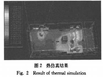 依據(jù)主要發(fā)熱元器件的損耗計算公式,得到各損耗值,將其導(dǎo)入仿真軟件;應(yīng)用Ansoft仿真軟件的內(nèi)部求解器取得實踐電路的3D發(fā)熱模型,如圖2所示。從圖中能夠明晰地看到電路內(nèi)部及各個元器件上的熱量散布狀況。依據(jù)仿真結(jié)果(圖2)可知,功率MOSFET上的熱量和變壓器的熱量最高(紅色局部),這與從電路理論上剖析求得的這兩種器件的功耗(見表2)相吻合。