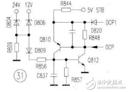 3、保護(hù)回路:U1芯片本身和3腳外圍電路構(gòu)成過流保護(hù)回路;N1繞組上并聯(lián)的D1、R1、C9元件構(gòu)成了開關(guān)管的反向電壓吸收保護(hù)電路,以提供Q1截止時(shí)的反向電流通路,保障Q1的工作安全;實(shí)質(zhì)上穩(wěn)壓回路的電壓反饋信號(hào),也可看作是一路電壓保護(hù)信號(hào)——當(dāng)反饋電壓幅度達(dá)一定值時(shí),電路實(shí)施停振保護(hù)動(dòng)作;24V的輸出端并聯(lián)有由R18、ZD2、單向晶閘管SCR組成的過壓保護(hù)電路,當(dāng)穩(wěn)壓電路失常,引起輸出電壓異常上升時(shí),穩(wěn)壓二極管ZD2的擊穿為SCR提供觸發(fā)電流,SCR的導(dǎo)通形成一個(gè)“短路電流”信號(hào),強(qiáng)制U1內(nèi)部保護(hù)電路產(chǎn)生過流保護(hù)動(dòng)作,電路處于停振狀態(tài)。