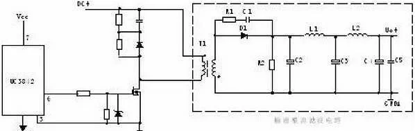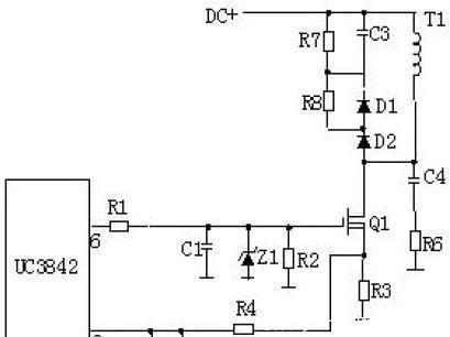R4、C3、R5、R6、C4、D1、D2組成緩沖器,和開關電源MOS管并接,使開關電源管電壓應力削減,EMI削減,不發生二次擊穿。在開關電源電源管Q1關斷時,變壓器的原邊線圈易發生尖峰電壓和尖峰電流,這些元件組合一同,能很好地吸收尖峰電壓和電流。從R3測得的電流峰值信號參加當前工作周波的占空比操控,因此是當前工作周波的電流約束。當R5上的電壓到達1V時,UC3842停止工作,開關電源電源管Q1當即關斷 。 R1和Q1中的結電容CGS、CGD一同組成RC網絡,電容的充放電直接影響著開關電源管的開關電源電源速度。R1過小,易引起振動,電磁干擾也會很大;R1過大,會降低開關電源管的開關電源速度。Z1通常將MOS管的GS電壓約束在18V以下,然后保護了MOS管。