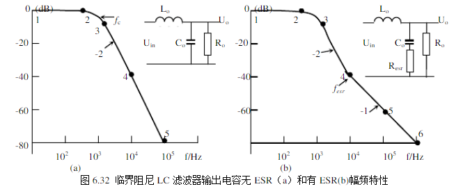濾波電容有ESR的LC濾波器幅頻特性如圖6.35b的曲線123456。大多數濾波電容具有ESR。在f0以上的低頻段,容抗遠遠大于ESR,從Uo看到阻抗僅是容抗起主要效果,斜率仍為-40dB/dec;在更