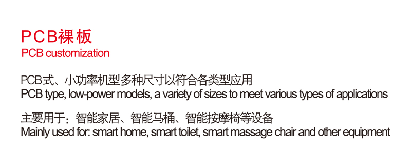 PCB式 小功率機型多種尺寸符合各類型應用 主要用于:智能家居、智能馬桶、 智能按摩椅等設備